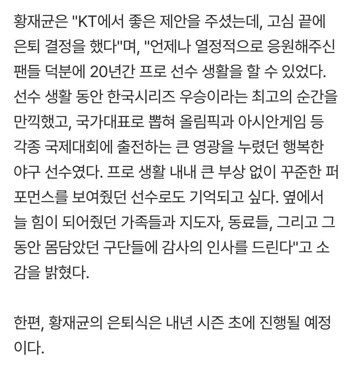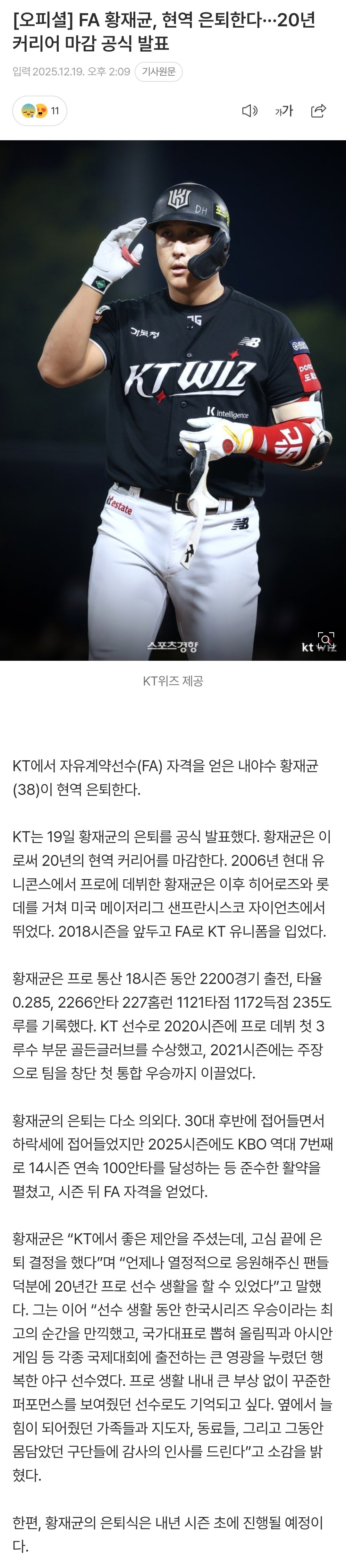 KT 위즈는 2025년 12월 19일, 내야수 황재균이 20년간의 프로 선수 생활을 마무리하고 현역 은퇴를 결정했다고 공식 발표했습니다.