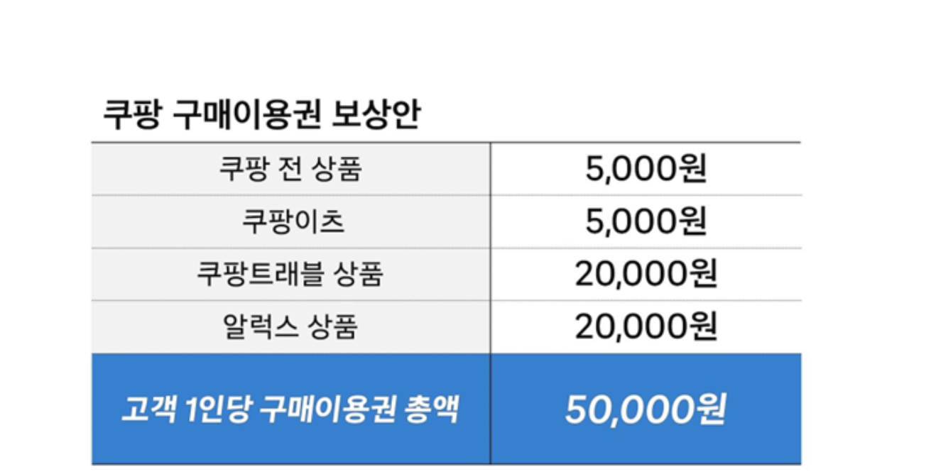 - 쿠팡 보상은 총 5만원이며, 4가지 서비스 이용권으로 분할 지급됩니다.
